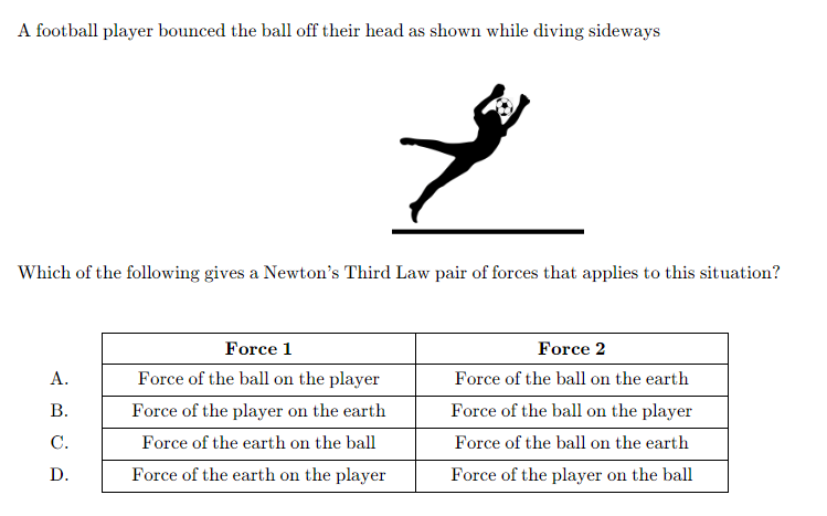- In the topic of Newton’s laws, questions that fall under Newton’s third law (equal and opposite forces), have a pattern where answers where both forces are labeled with similar key words are the correct answer. Here is a picture with an example of this - where the answer is C.